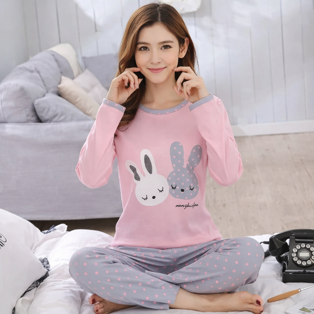 Composé d’un haut à manches longues et col rond et d’un pantalon souple à taille élastique, il offre confort, douceur et liberté de mouvement, idéal pour dormir ou se détendre à la maison.